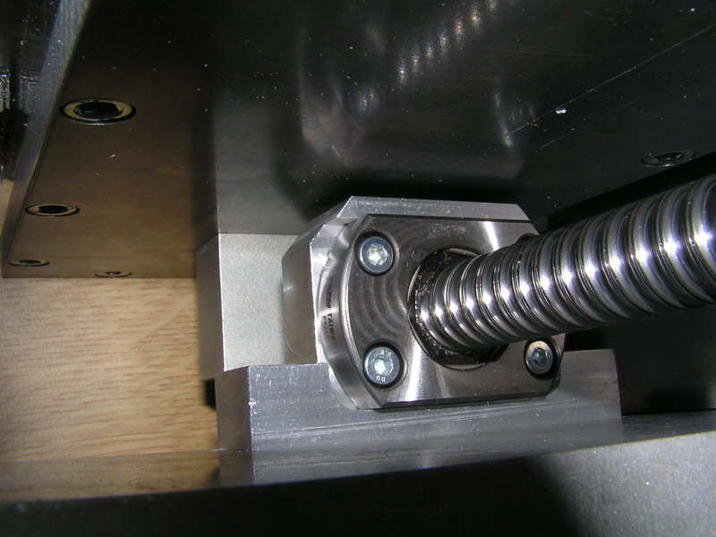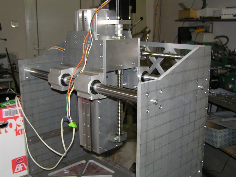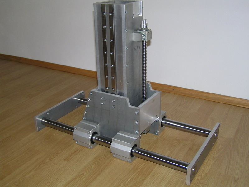 Bohužel vodní paprsek nedělá kolmý řez, takže bylo nutné vše obrobit na fréze. Všechny díly jsou do sebe zafrézované a následně sešroubované imbus šrouby M6. Začal jsem na ose Z (vertikální ose). Na tuto osu jsem použil lineární vedení IKO. Jako posuvové šrouby jsem zvolil šrouby kuličkové. Jedná se o přesné šrouby s neznatelnou vůlí. Všechny šrouby mají stoupání 5mm. Na ose Z a Y je průměr 16mm a na ose X je průměr 20mm.