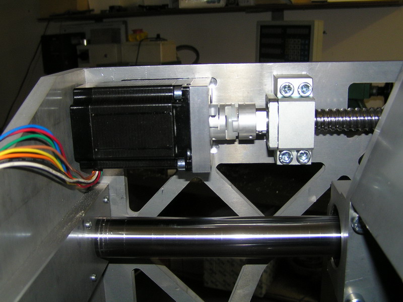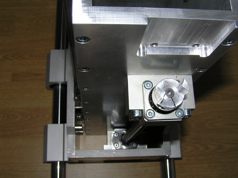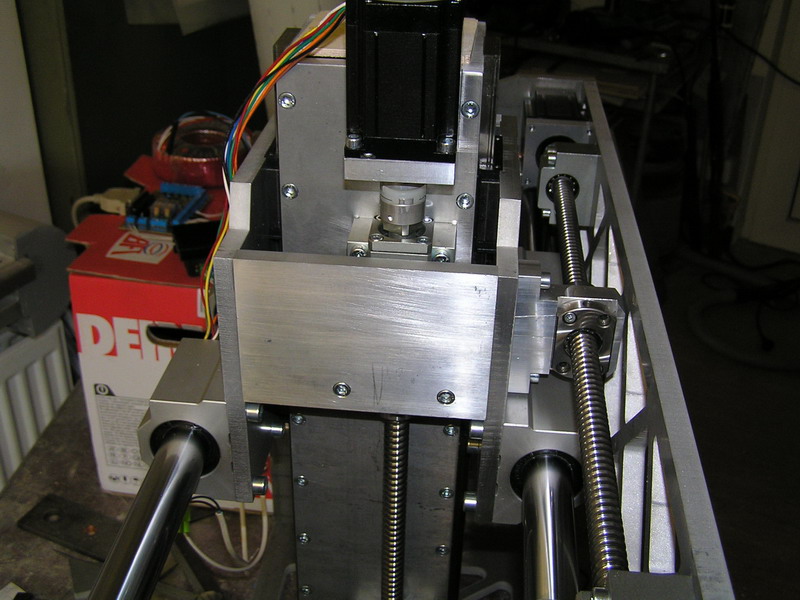 Následovalo zhotovení vlastního portálu. Zde jsou velice důležitá "záda" (je to ta odlehčená část). Tento prvek zabraňuje kmitání portálu při obrábění a celkově zvyšuje tuhost konstrukce. Výše popsané osy byly do portálu následně vsazeny. Ve spodní části portálu jsou umístěna další celkem čtyři lineární vedení. Pomocí nich, se může poměrně těžký portál pohybovat po stole naprosto lehce. Zde jsem použil tzv. podepřené tyče. Jedná se v podstatě o klasickou broušenou tyč (popsanou výše), ale ta je z důvodu pevnosti po celé své délce podepřena. Na níže uvedených fotkách jsou již nainstalované krokové motory, které popíšu níže.