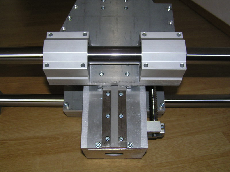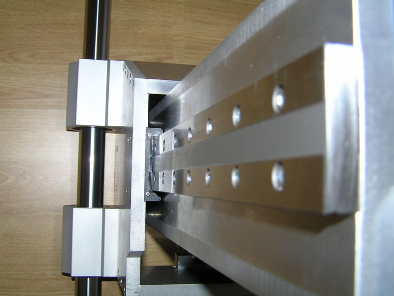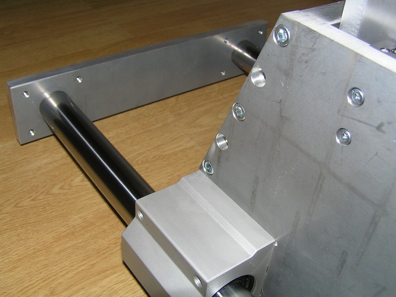 Dále následovaly práce na ose Y. Na tuto osu jsem zvolil nepodepřené tyče o průměru 30 mm. Tyto tyče jsou broušené a kalené. Na nich běhají celkem čtyři domky s lineárními ložisky. Důležitá je tady naprostá souosost těchto tyčí. I odchylka 0.02 mm je tady znát. Oba dva koncové prvky (ty obdélníky na koncích tyčí) jsem dělal najednou na jedno upnutí, takže je souosost zaručena.