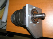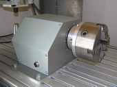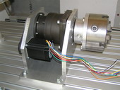 Pokud chcete obrábět polotovar z více jak jedné strany, je zapotřebí jej umístit do čtvrté (rotační osy - dále jen RO). U tohoto zařízení je vždy největší problém - vůle. Pokud bude na této ose velká vůle, vyrobí se zmetek a je zde také velké riziko lámání nástrojů. Většinou se jako základ používá převodovka, na kterou je upevněno sklíčidlo. Povedlo se mi sehnat robotickou planetovou převodovku s opravdu malou vůlí (dvě úhlové minuty). Převodovka je velice robusní a má převodový poměr 7:1. Na výstupní hřídel o průměru 25mm bylo možno dát bez problémů unašeč sklíčidla.