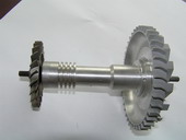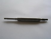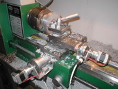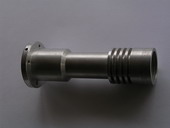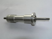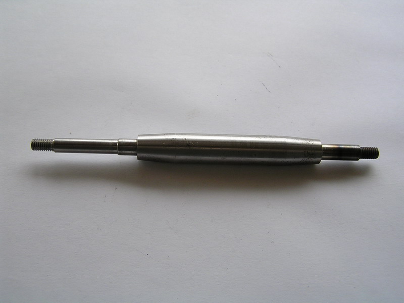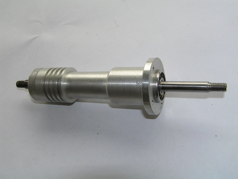 Dalším dílem byla hřídel. Jako základ je použit imbus šroub M16x180 12.9. Nahrubo byla vytočena na soustruhu a následně ve hrotech přebroušena "na nulu". Na obou koncích hřídele jsou LEVÉ závity M6. Vzhledem k tomu, že je hřídel obroušena na jedno upnutí, není zapotřebí ji vyvažovat. (na fotce je hřídel již použitá - na konci je dobře patrná horká část)