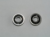 Dalším dílem je pouzdro hřídele. Je vyrobeno na soustruhu z duralu. Dodatečně jsem na zadní části vyvtvořil žebrování, které napomáhá chlazení zadního ložiska. Na další fotce jsou keramická ložiska velikosti 608 (cena za kus cca 1000,- Kč) a celková sestava s hřídelí . Cena ložisek je vysoká, ale při dobrém vyvážení vydrží až 50h běhu.