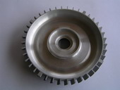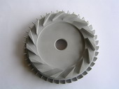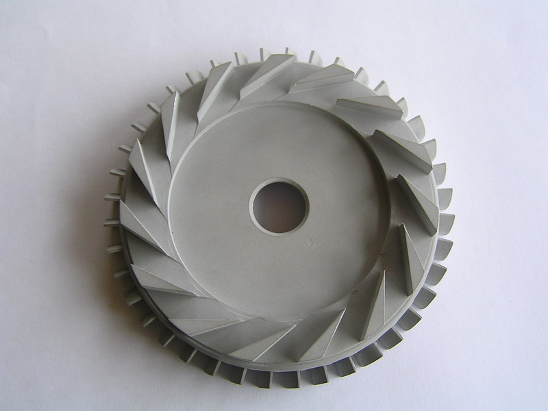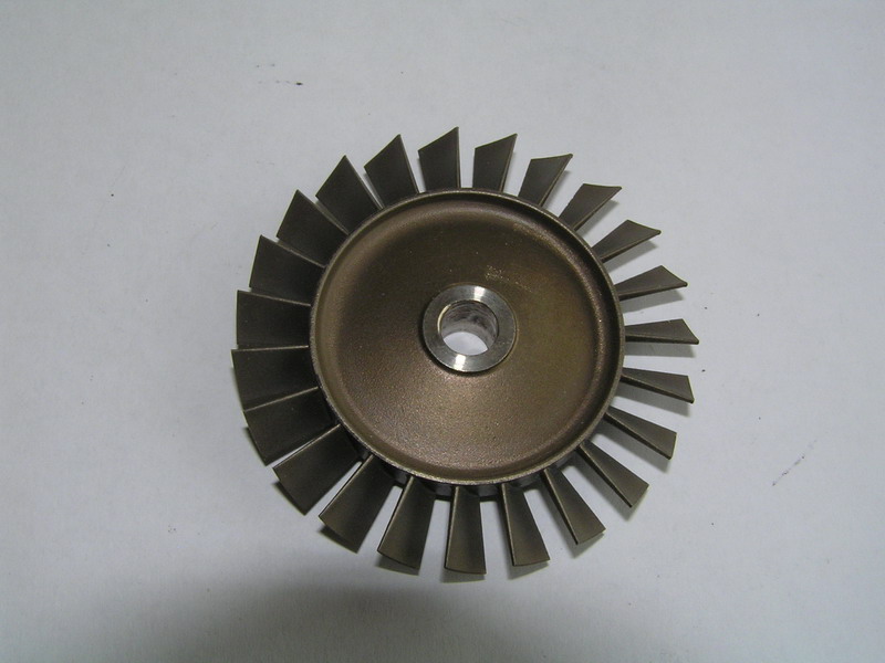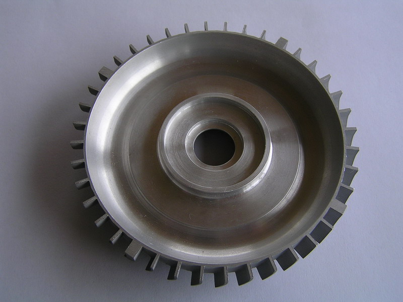 Opravdovým oříškem jsou rozváděcí lopatky kompresoru. Jsou vyrobeny z jednoho kusu duralu. Polotovar je soustružen a lopatky následně frézovány. Tenkrát jsem ještě neměl CNC frézu, takže vše vzniklo na klasické fréze za použití otočného stolu a dělícího aparátu. Trojúhelníkové lopatky jsou dost choulostivé na přesnost. Pokud mezi nimi uděláte větší mezeru bude docházet k pumpáži turbíny (bude tam moc vzduchu, který se bude vracet zpět do kompresoru). Pokud se mezery udělají menší, bude se turbína vzhledem k nedostatku vzduchu přehřívat a špatně spalovat. Po obrobení jsem výrobek opískoval, abych se zbavil otřepů a stop po obrábění.