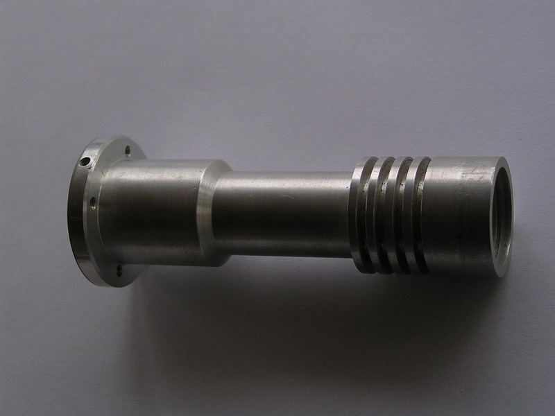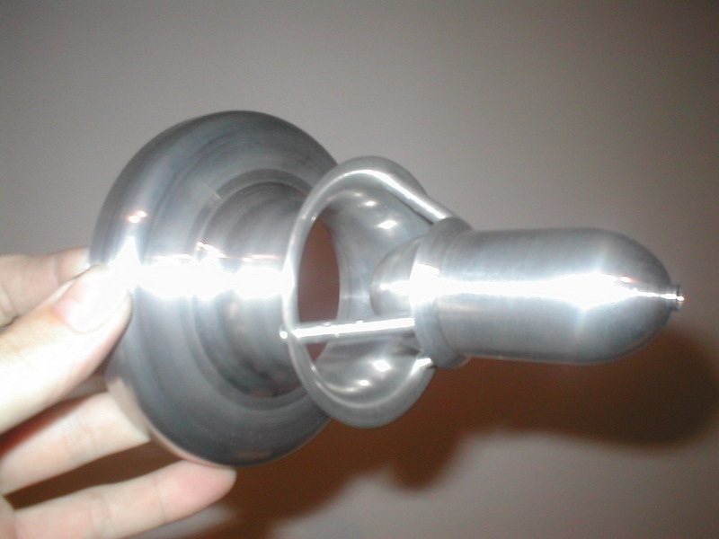 Protikus kompresoru (trumpeta) je vyrobena z duralu. Na první pohled složitý díl, ale překvapivě poměrně lehce vyrobitelný. Je tam pouze jediný rádius na kterém opravdu záleží (musí být schodný s rádiusem na kompresoru, budoucí mezera mezi tímto dílem a kompresorem je 0.1 mm) - ostatní je lidová tvořivost. S tím souvisí i tělo startéru, které je taktéž soustruženo z duralu a následně upevněno pomocí tří rozpěrek k "trumpetě".